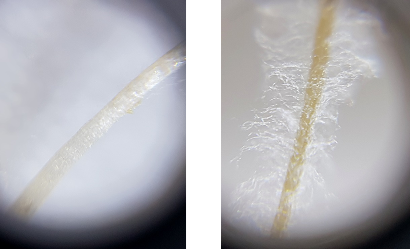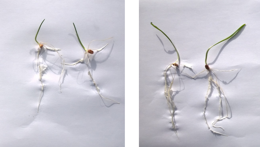 На фото зображені рослини озимої пшениці на третій та п’ятий день після проростання. Спостерігаємо, що рослини, оброблені стимулятором росту Basfoliar® Kelp SL, мають значно міцнішу кореневу систему та швидше розвиваються з моменту проростання. Уже через 5 днів рослини з обробкою почали активно нарощувати надземну частину, на відміну від рослин, які не оброблялися. Нижче на фото зображені корінці під мікроскопом: у варіанті з Basfoliar® Kelp SL спостерігається велика кількість кореневих волосків.