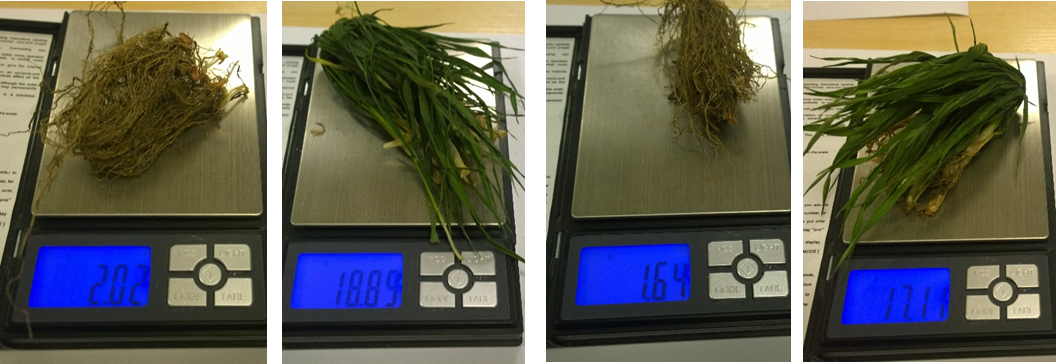На наступних фото — рослини у фазі осіннього кущення. Вони суттєво відрізняються від контрольного варіанта, мають краще розвинену кореневу систему та надземну частину. Також було проведено зважування кореневої системи й надземної маси.
