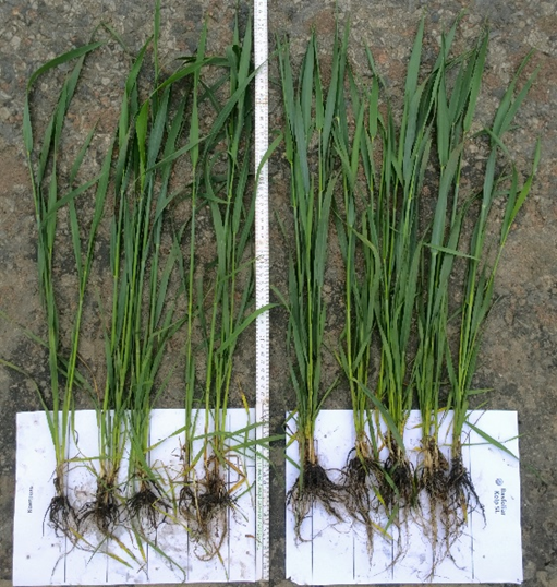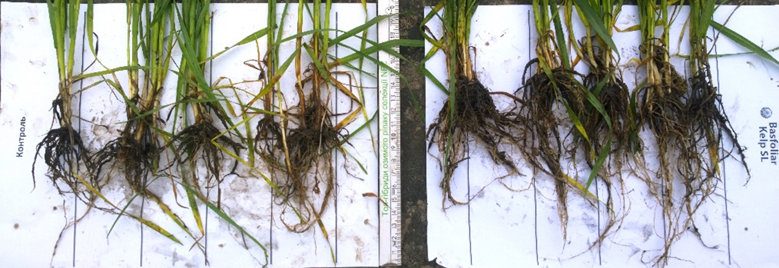 У подальшому ми провели заміри у фазі трубкування та визначили, що у варіанті, де застосовувався Basfoliar® Kelp SL, рослини мали краще розвинену й потужнішу кореневу систему.