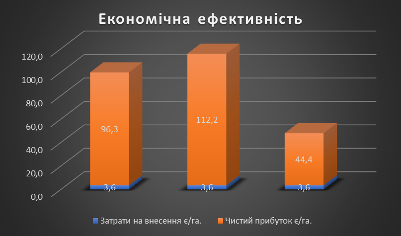 Виходячи з розрахунків економічної ефективності застосування добрива варто відмітити, що можна отримати додатковий чистий прибуток за роки досліджень у середньому — 84,3 EURO/га.